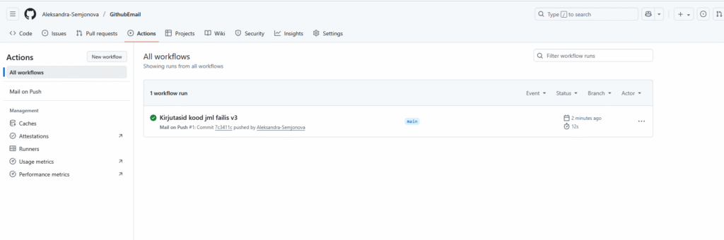 Testisin töövoogu, lükates muudatused repo-sse. Kontrollisin tulemust repo Actions-vahekaardil.