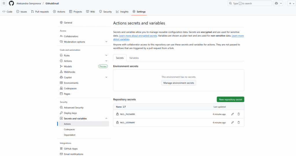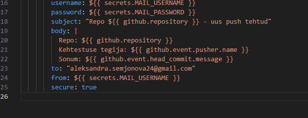 4. Lisatud kaks GitHubi saladust repos seadistustesse: MAIL_USERNAME ja MAIL_PASSWORD.