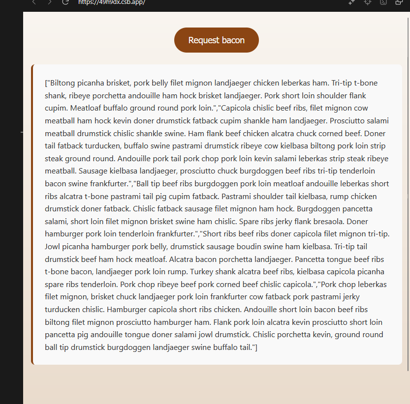 5. Vajuta lehel nuppu — näed API vastust (tekst/JSON „bacon” kohta).