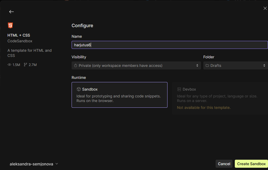 - Avage CodeSandbox → valige mall Static (et lihtsalt hostida index.html).